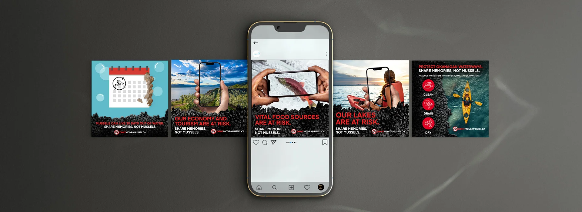 The Don’t Move a Mussel (DMM) campaign is an initiative aimed at protecting Okanagan waters from invasive zebra and quagga mussels. The campaign, developed by Habit, seeks to raise awareness about the risks of aquatic invasive species (AIS) spread through watercraft and improperly disposed aquarium plants and mosses. By emphasizing the personal and collective consequences of these invasions, the goal is to inspire proactive behaviors and encourage prevention efforts among residents and visitors.