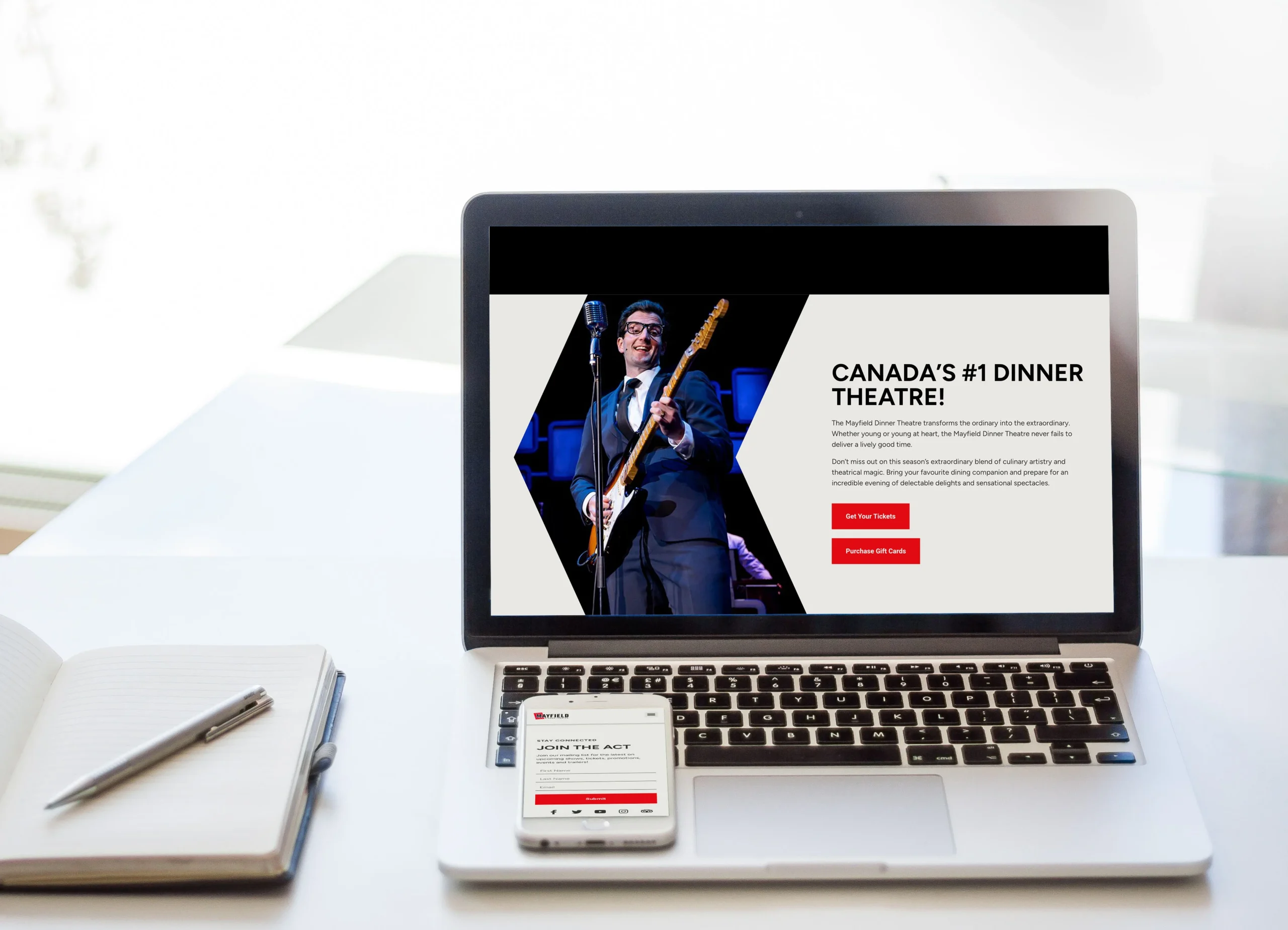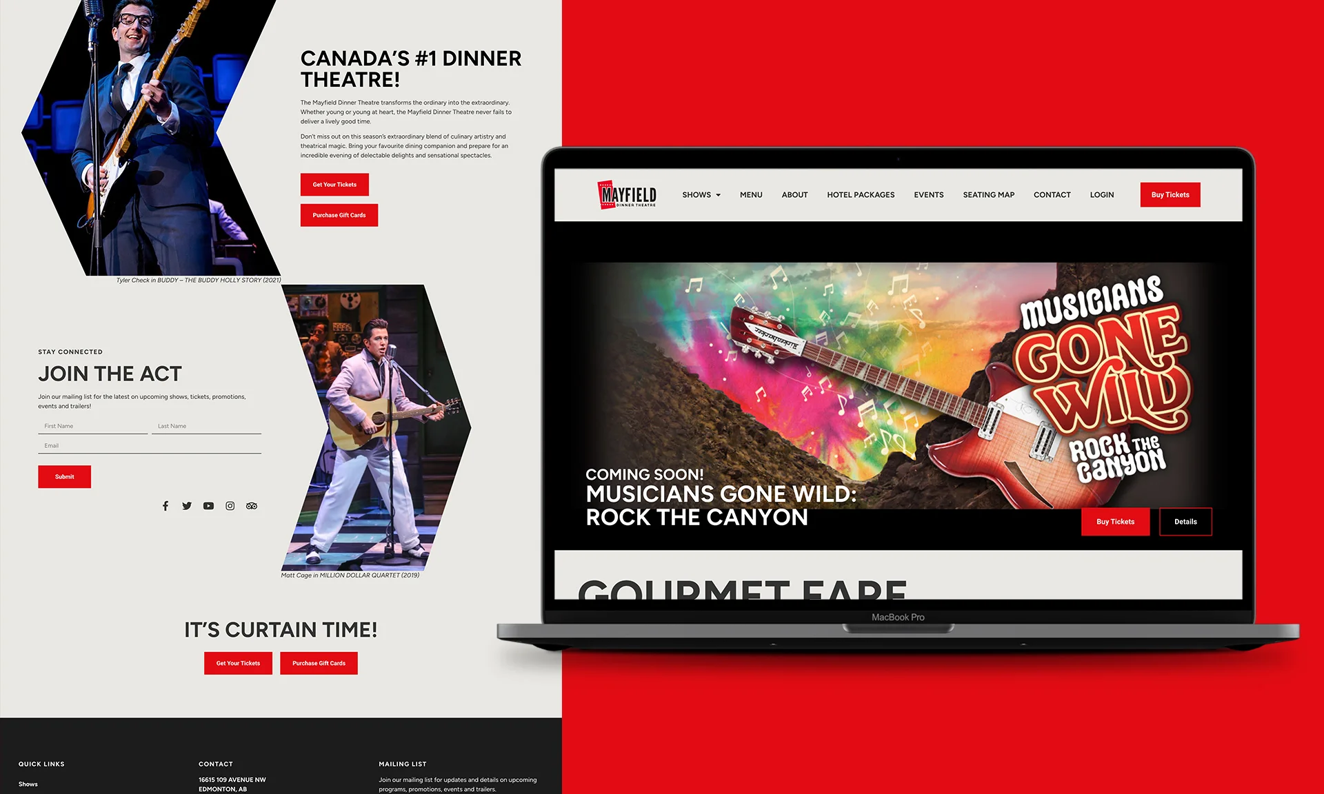 Mayfield wanted just a simple logo refresh. They wanted the logo to be more horizontal with an updated colour palette that was more exciting and theatrical. We updated the brand and website copy to appeal to a younger demographic, as well as included a tagline “Gourmet Fare, Broadway Flair!” to really add to the exciting and theatrical refresh overall.